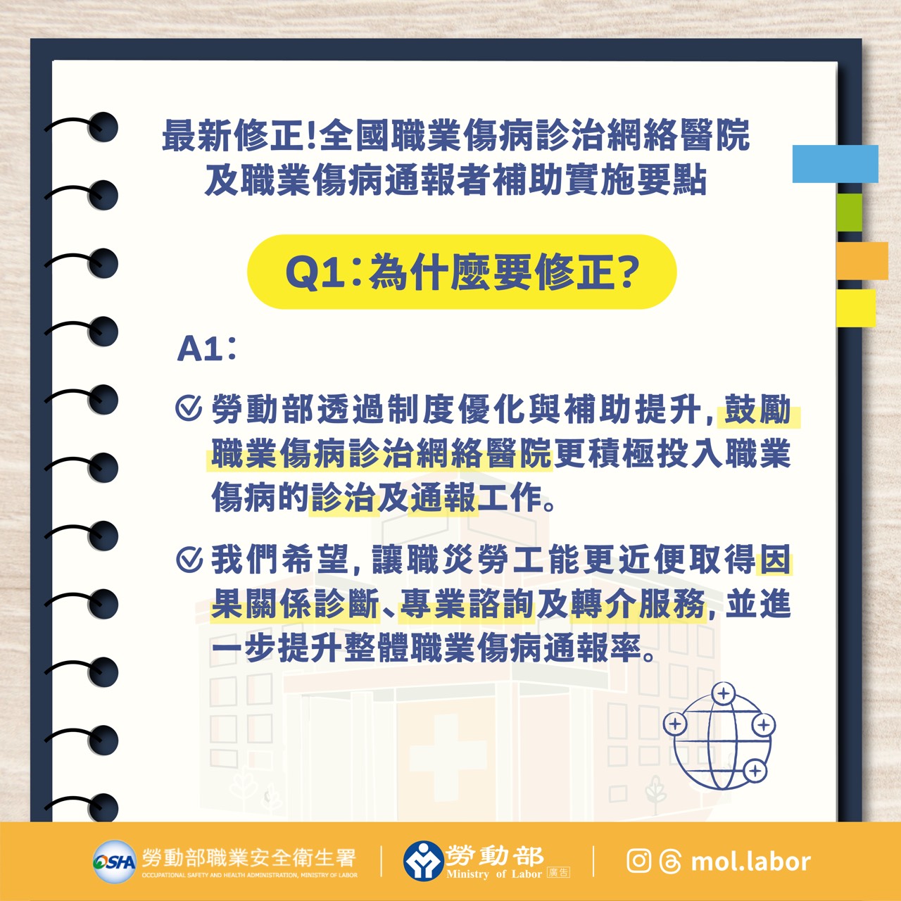 勞動部修正發布「全國職業傷病診治網絡醫院及職業傷病通報者補助實施要點」,透過制度優化與補助提升,鼓勵職業傷病診治網絡醫院更積極投入職業傷病之診治及通報工作,讓職災勞工能更近便取得因果關係診斷、專業諮詢及轉介服務,並進一步提升整體職業傷病通報率。