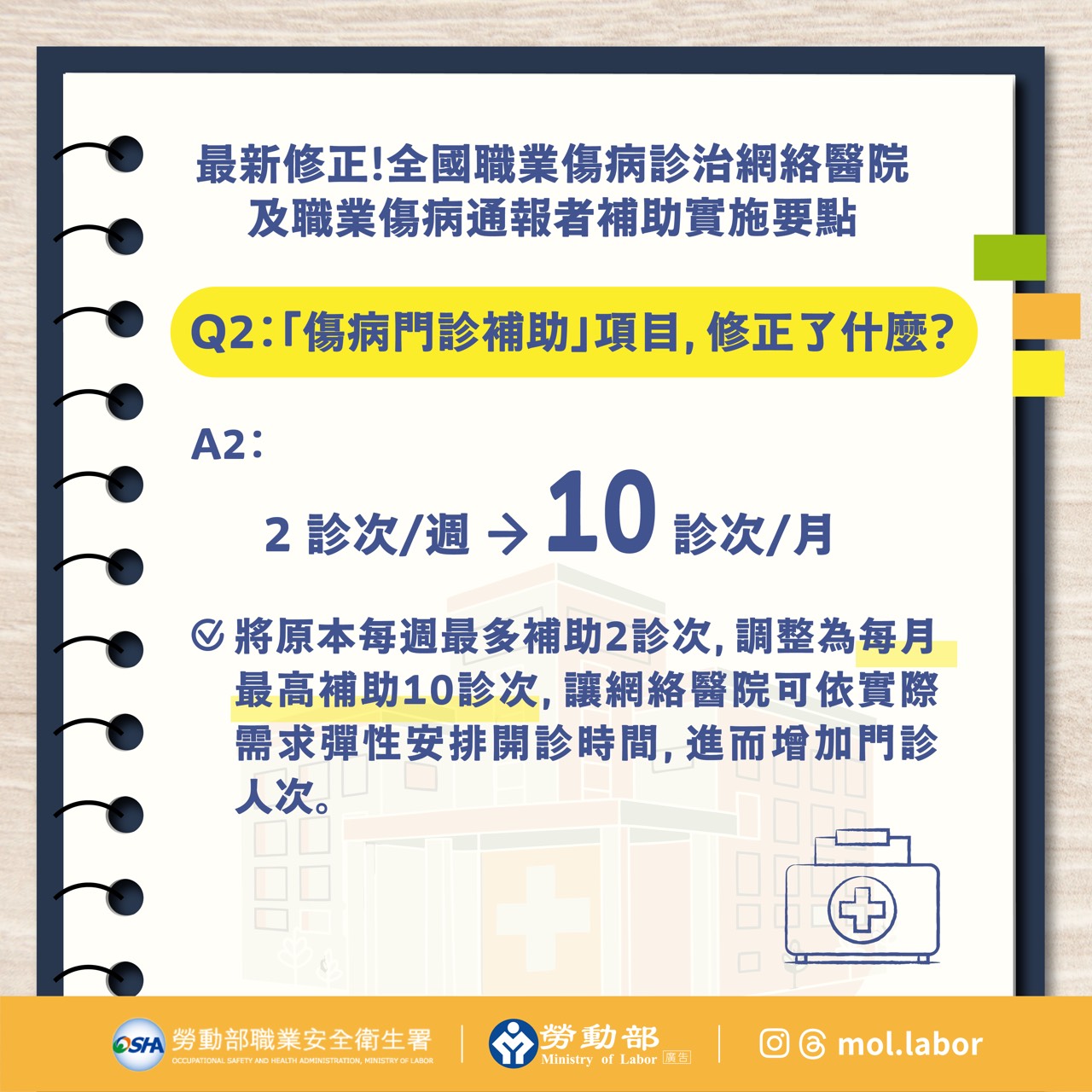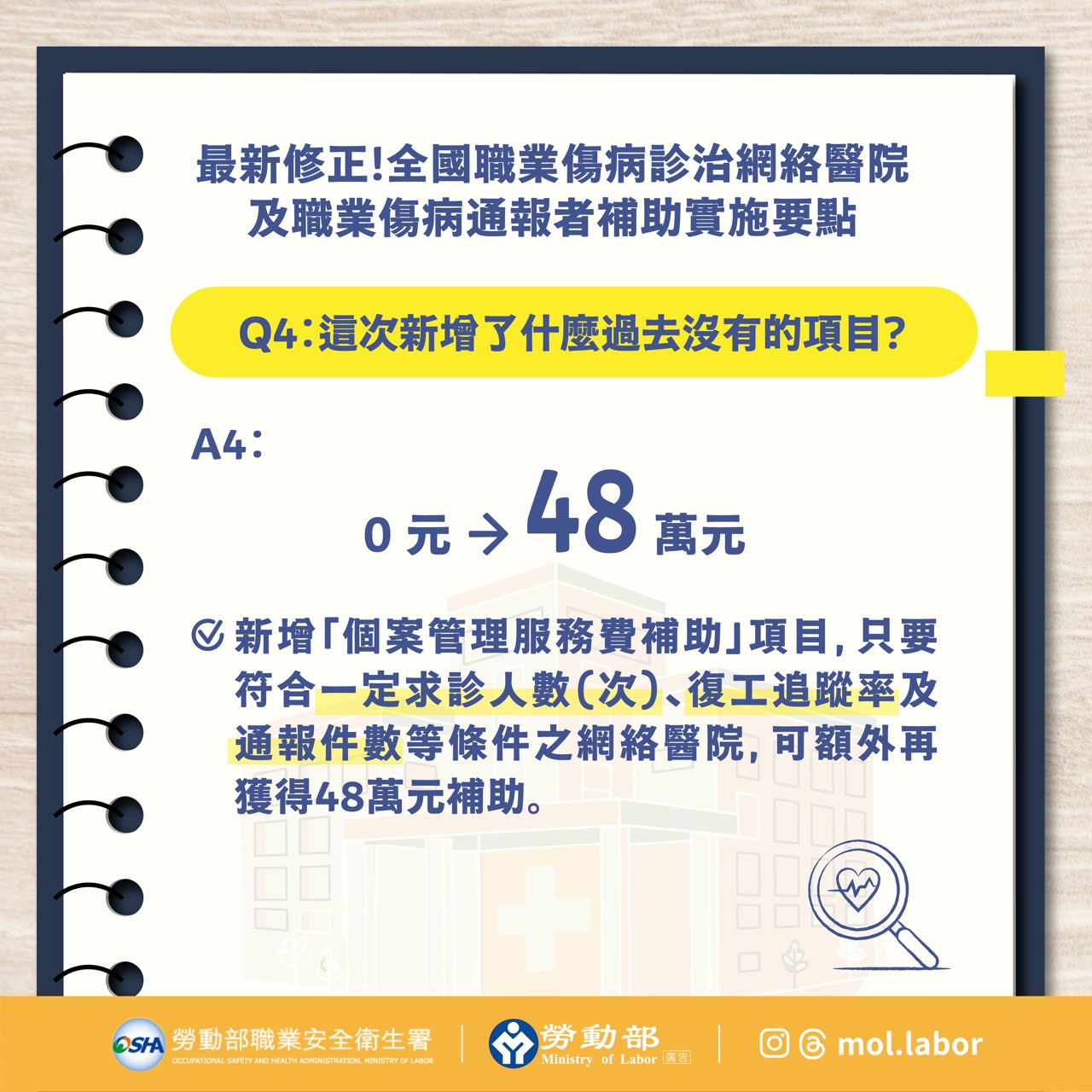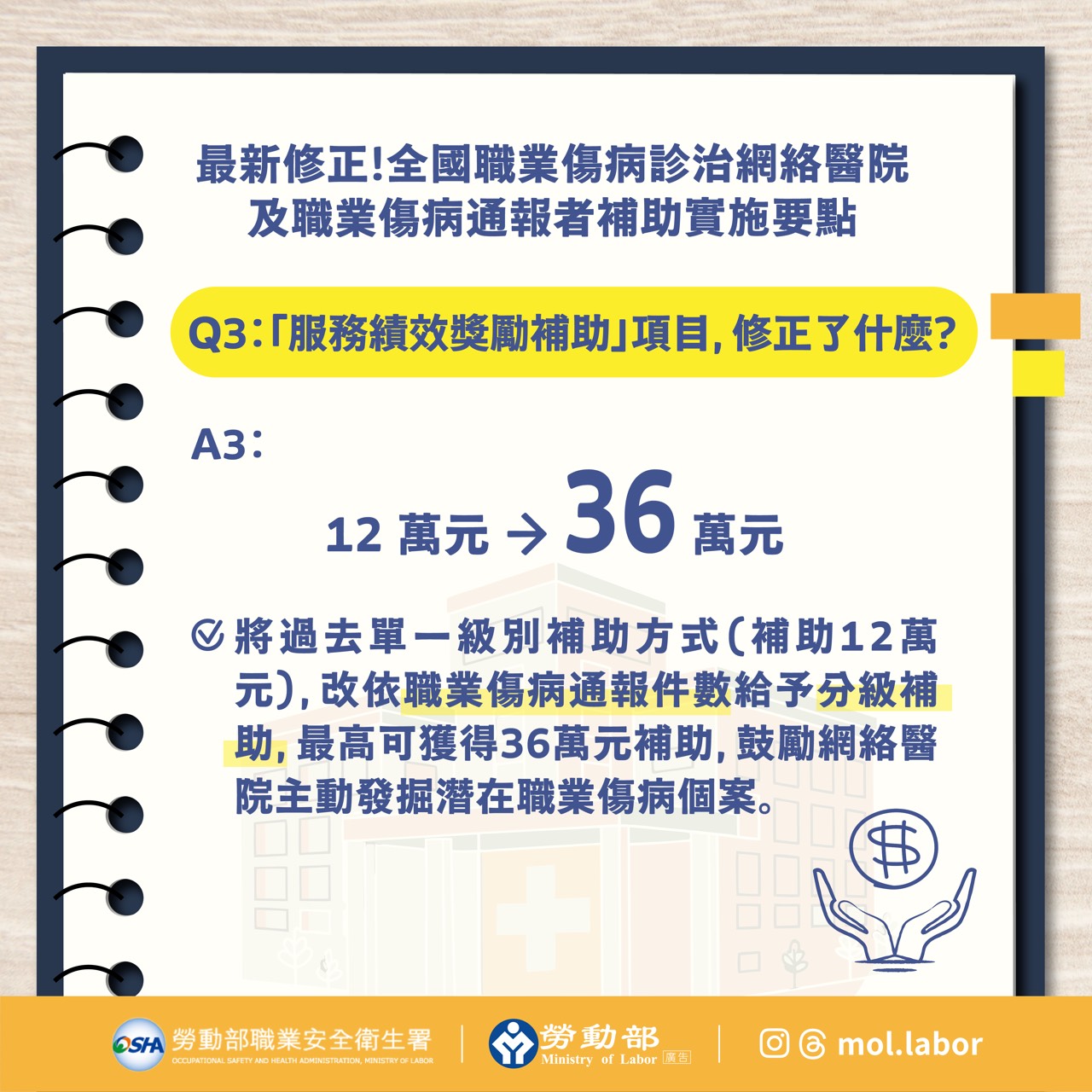 此次修正係透過制度優化與增加補助,以利職災勞工能更早被發現;及時獲得協助及支持。首先,在「傷病門診補助」項目,將原本每週最多補助2診次,調整為每月最高補助10診次,讓網絡醫院可依實際需求彈性安排開診時間,進而增加門診人次。其次,在「服務績效獎勵補助」項目,將過去單一級別補助方式(補助12萬元),改依職業傷病通報件數給予分級補助,最高可獲得36萬元補助,鼓勵網絡醫院主動發掘潛在職業傷病個案。此外,也新增「個案管理服務費補助」項目,只要符合一定求診人數(次)、復工追蹤率及通報件數等條件之網絡醫院,可額外再獲得48萬元補助。