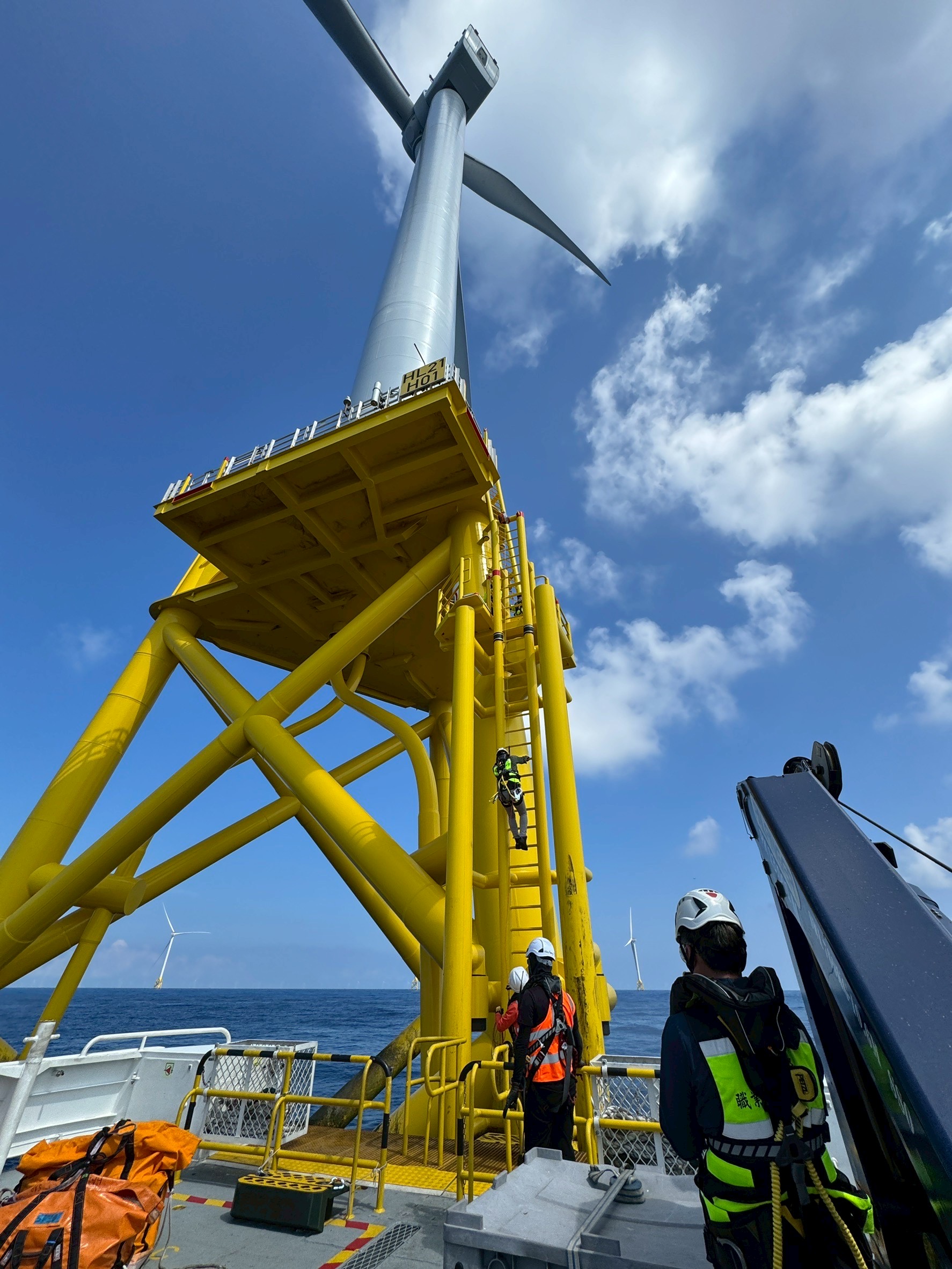 勞動檢查員搭乘接駁船攀登垂直爬梯登塔檢查1
