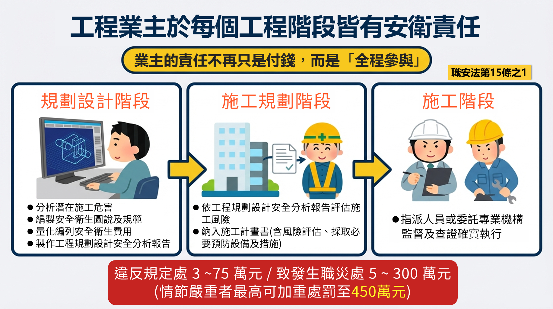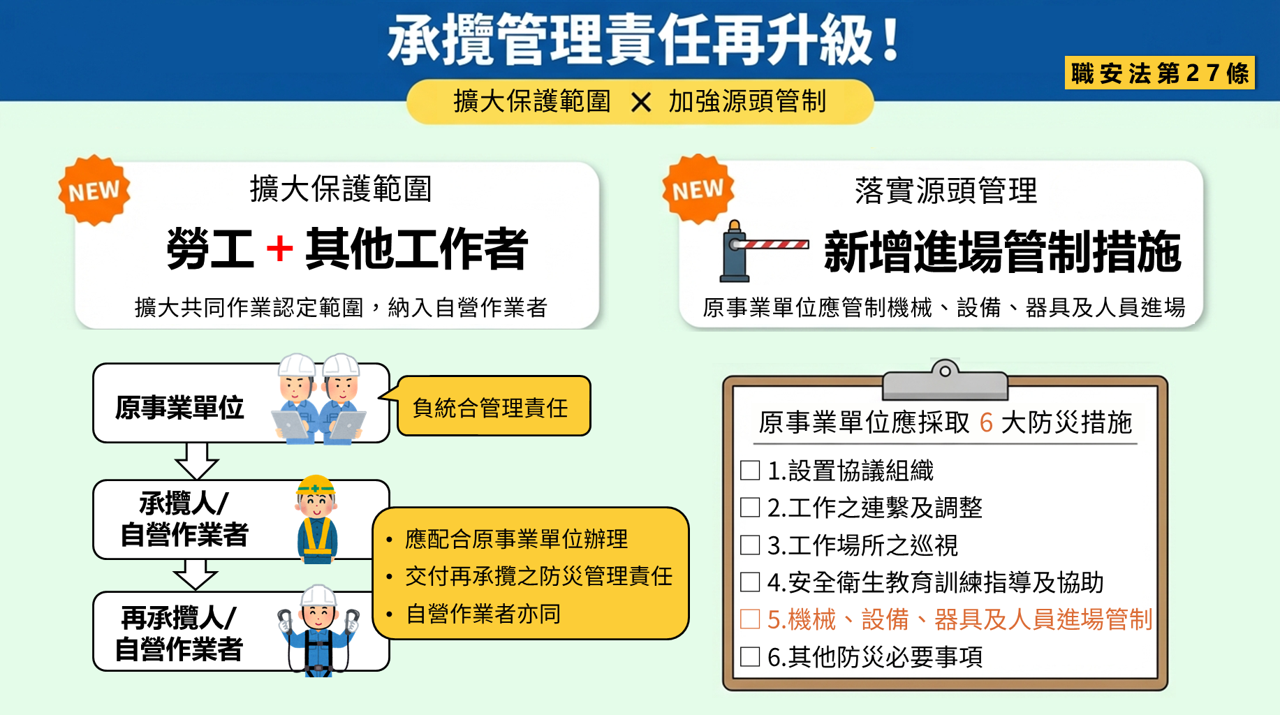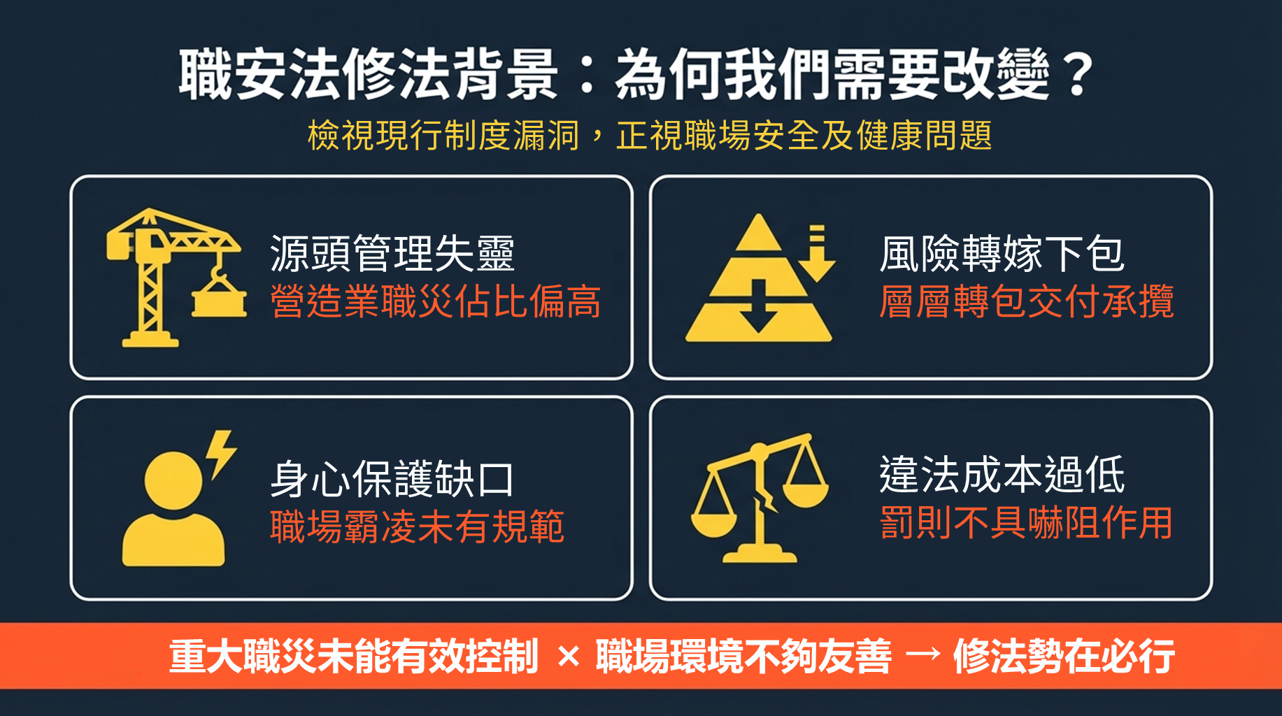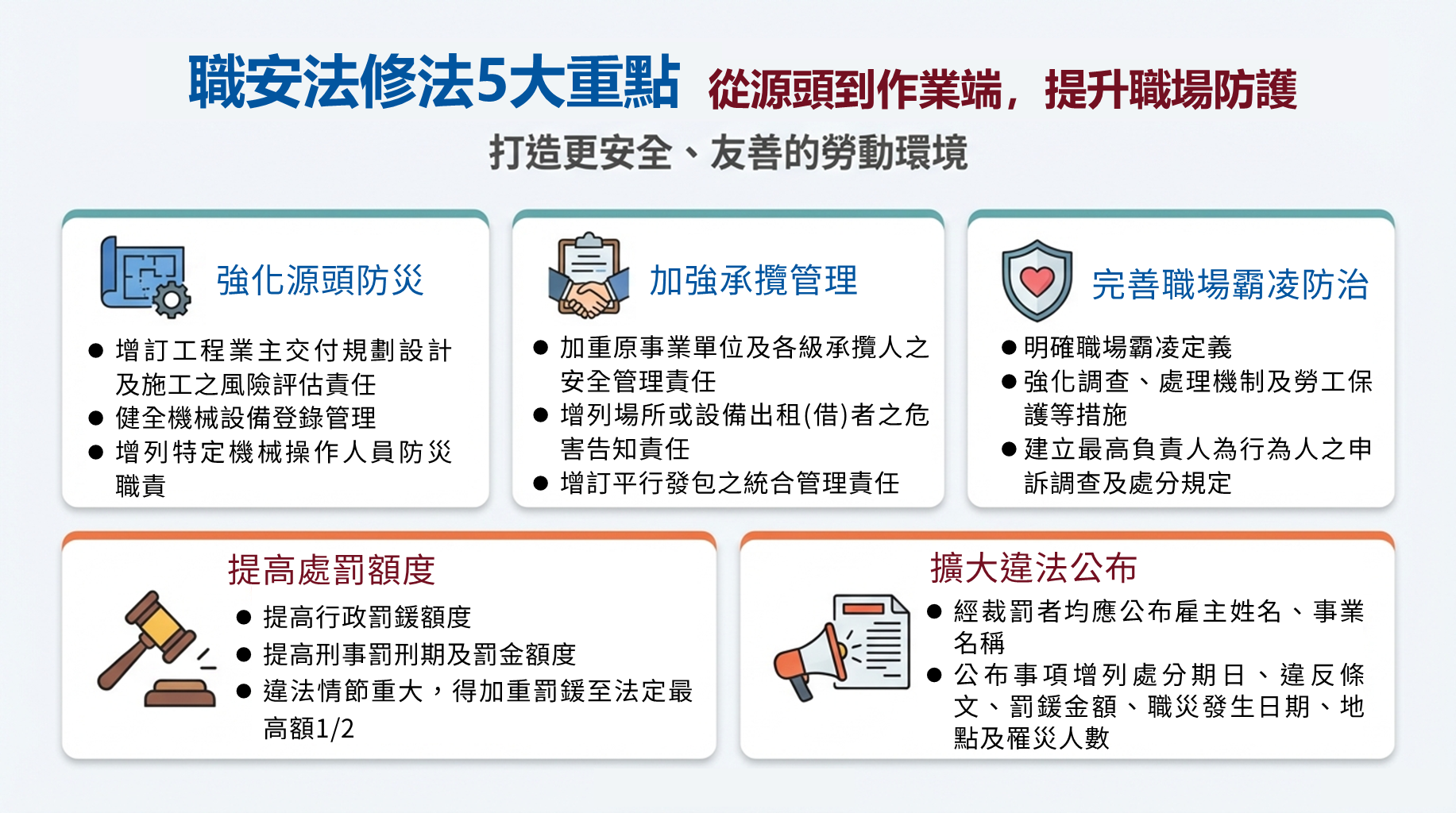 職業安全衛生法(下稱職安法)修正條文於114年12月19日經總統公布,修正重點包含強化營造工程源頭防災、加強承攬安全管理、完善職場霸凌防治、提高處罰額度及擴大違法公布等,從源頭到作業端提升職場防護,展現政府守護勞工身心安全健康之決心。