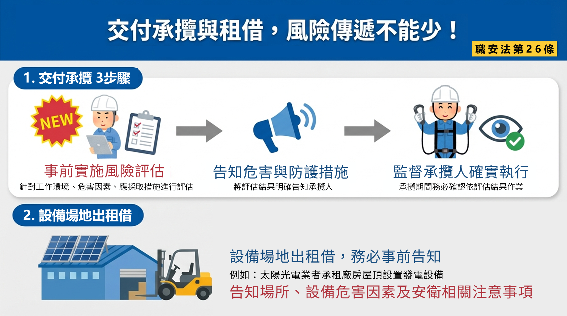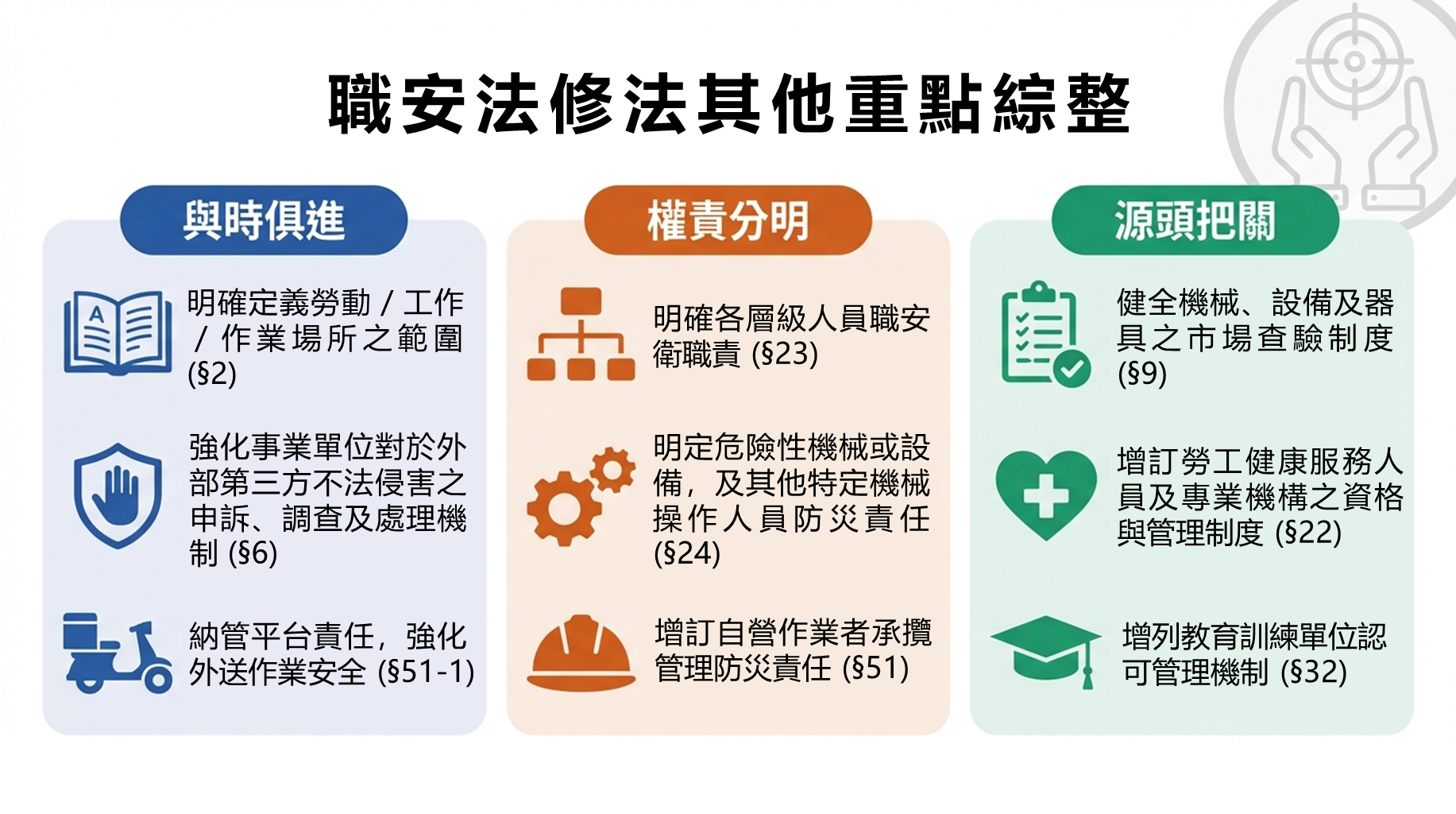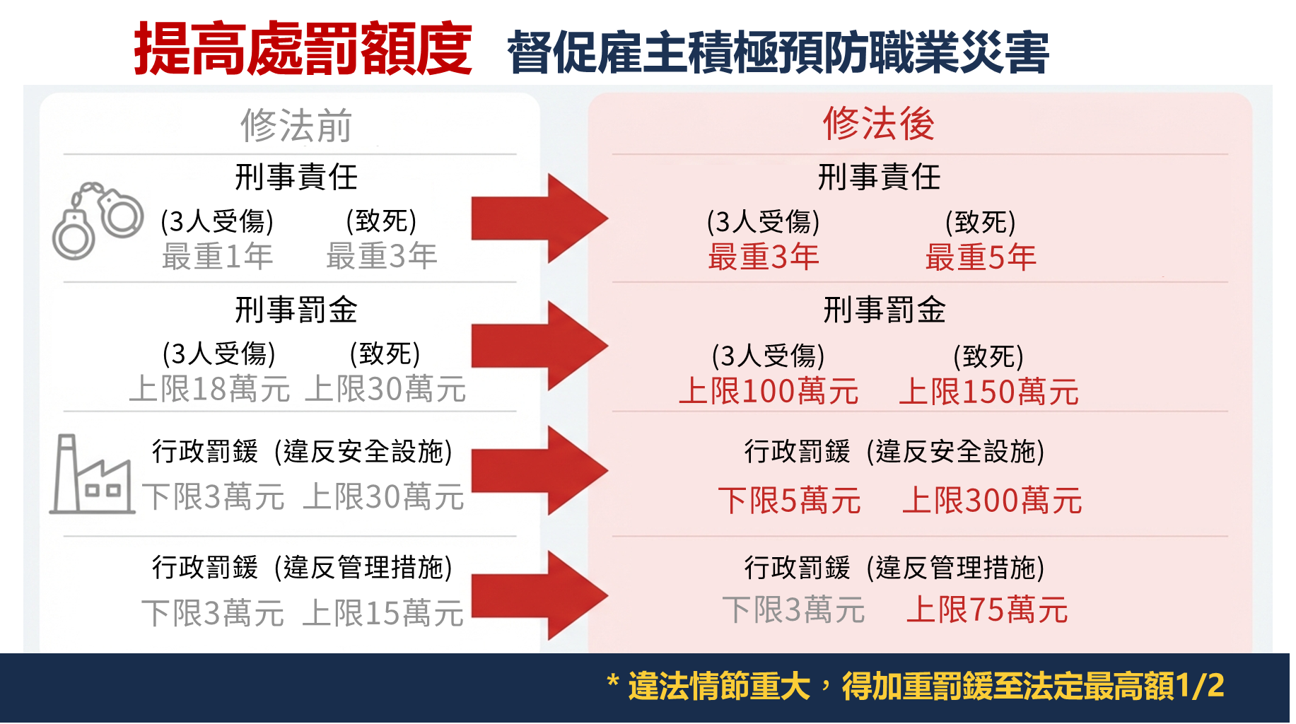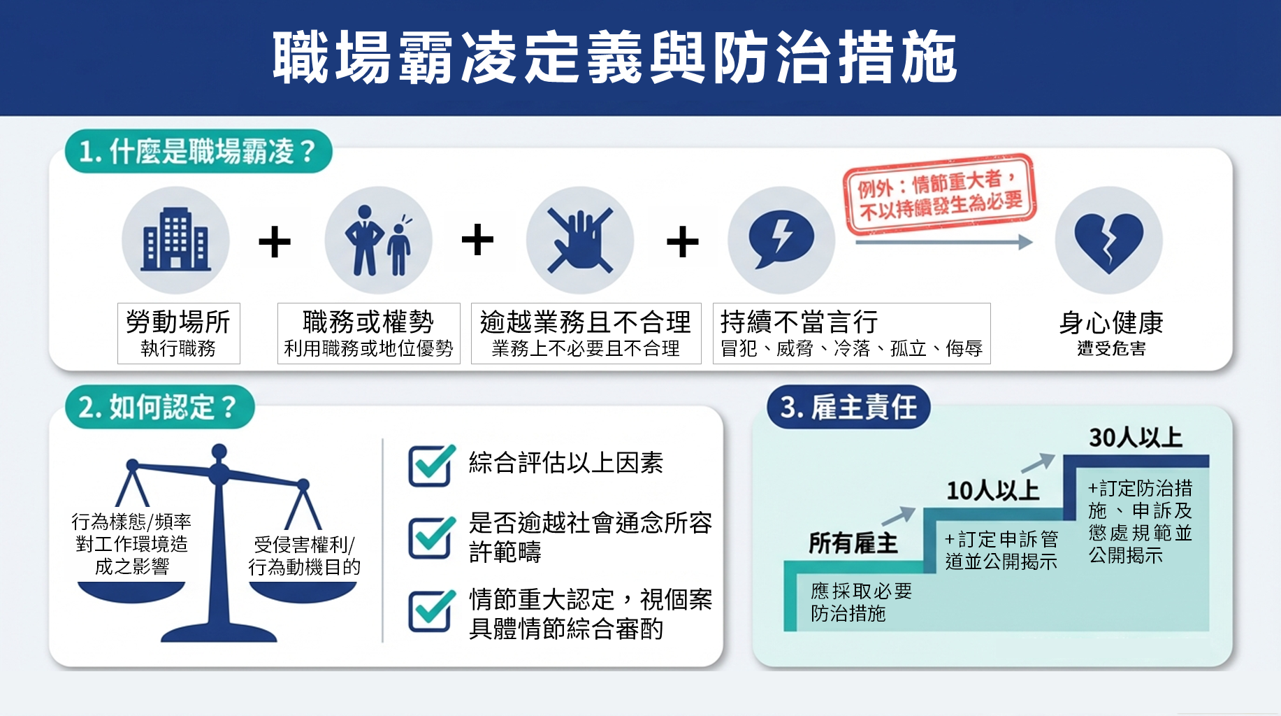為協助事業單位落實法令及保障勞工權益,並使一般民眾瞭解本次修法內容,本署製作職安法修法宣導懶人包(如附件),內容包含修法重點圖解、職場霸凌申訴調查處理流程及各項違法罰則等,歡迎各界下載運用。