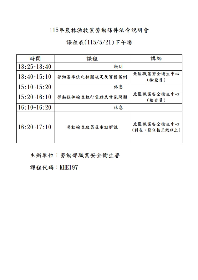 為協助雇主充分理解及遵守勞動條件法令、重視勞工勞動條件,並促進勞資雙方和諧及保障勞工權益,特辦理旨揭說明會請貴單位派員參與。 辦理時間、地點:115年5月21日(星期四)下午13時25分至17時10分於宜蘭社福館(六樓第三會議室)(宜蘭縣宜蘭市同慶街95號)。 本次說明會名額有限,請參加人員儘速於本署網站(https://www.osha.gov.tw/)登錄報名「勞動部職業安全衛生署網站首頁\便民服務\線上報名。