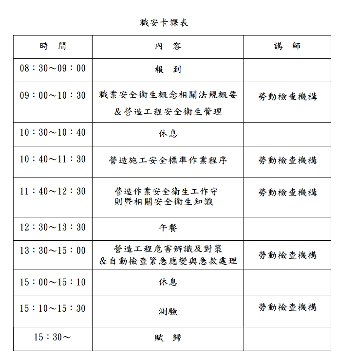 本署南區職業安全衛生中心訂於115年5月21日(星期四)9時至15時30分,假金門縣政府多媒體簡報室(地址:金門縣金城鎮民生路60號)舉辦「115年營造業安全衛生教育訓練」(臺灣職安卡),針對金門縣無一定雇主之營造業勞工辦理6小時職安卡教育訓練,本次活動一律採線上報名,本署職安卡網站報名(https://oshcard.osha.gov.tw/),點選「一般勞工線上報名」,點選115年5月21日金門縣場次並填寫相關資訊,名額70名,額滿為止。