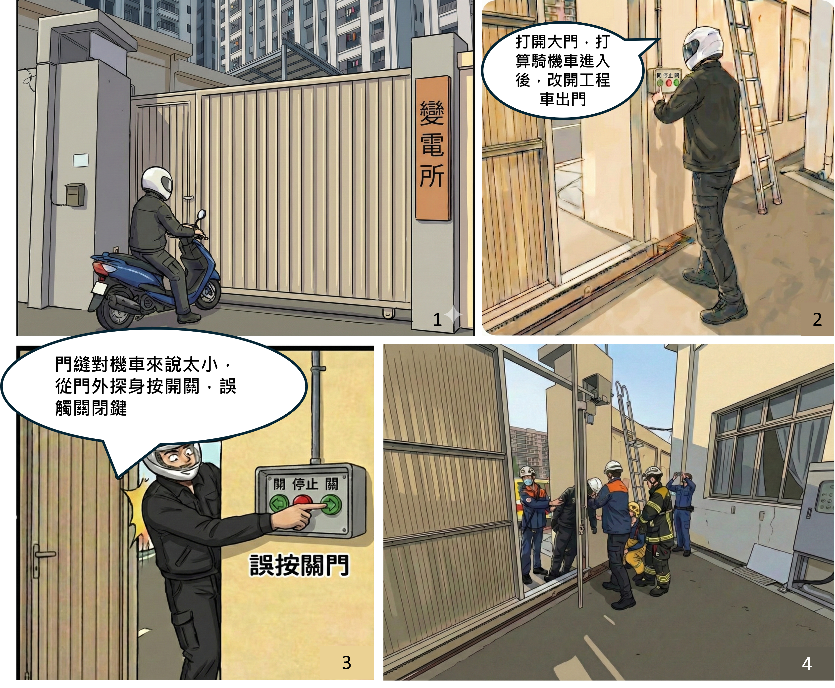 台灣電力股份有限公司左營二次變電所於115年1月14日上午7時23分許,發生勞工欲進入變電所時,因操作電動鐵門不當遭夾致死之遺憾事故;當時,勞工欲將自有機車騎入變電所,改開巡檢工程車出門,雖已先下車行進入小門,並開啟電動鐵門部分距離,惟走出門外準備騎車進入時,因發現開啟空間不足,在未確實辨識開關鍵方向的情況下,由門外探身進入門縫觸按開關,導致誤觸關閉鍵而遭電動鐵門夾擊傷重不治。