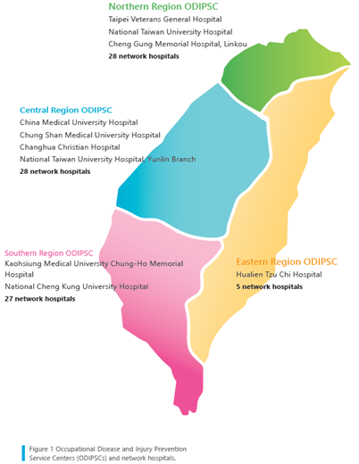 OSHA has set up Occupational Disease and Injury Prevention Service Centers (ODIPSCs) in northern, central, southern, and eastern Taiwan, covering the entire country. Combined with the occupational medicine departments at hospitals across the country, these constitute an occupational injury and disease prevention network and reporting system. (See Figure 1 for the network.) The ODIPSCs and network hospitals are part of a reporting system, and assist in conducting identification and investigations of occupational diseases.